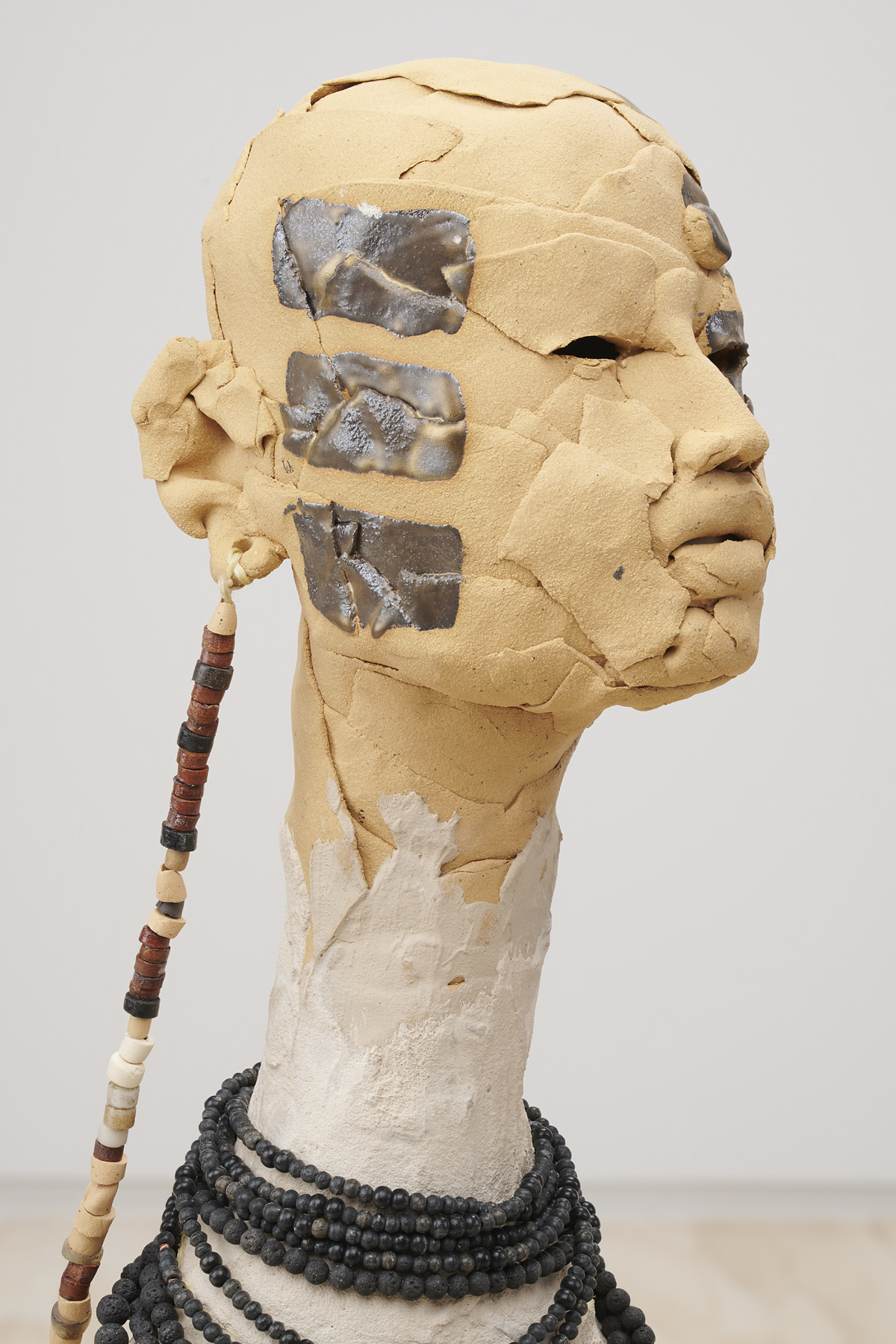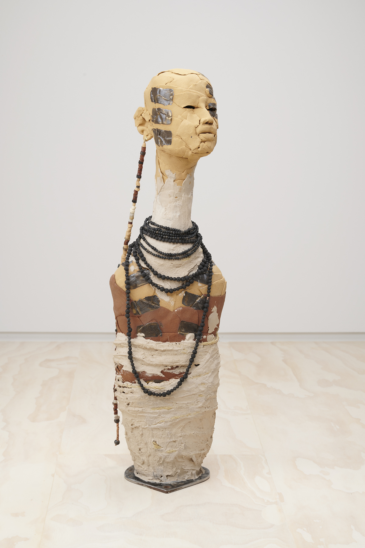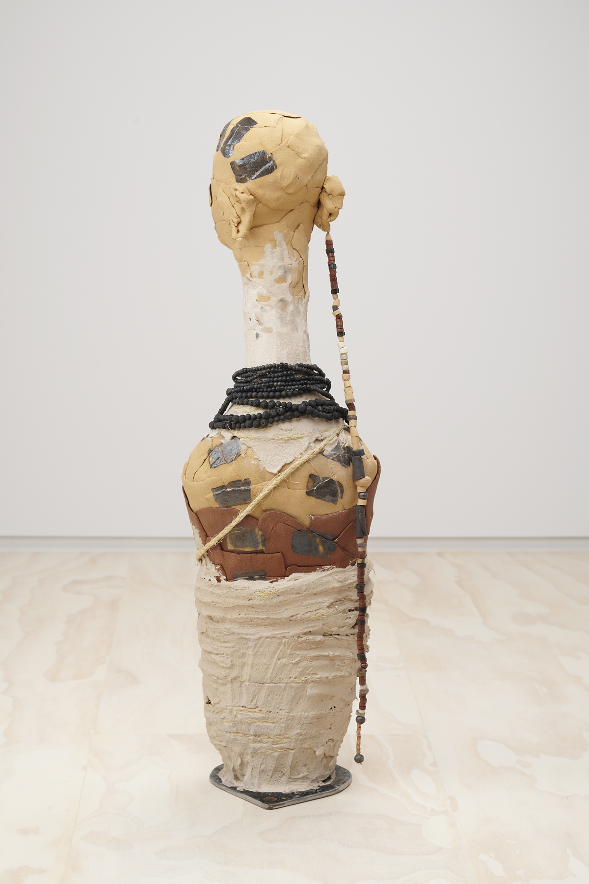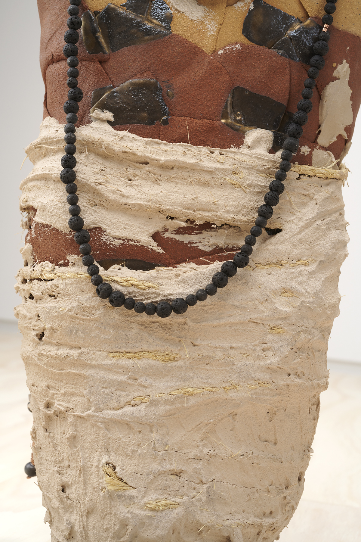 Rose B. Simpson (Santa Clara Pueblo), Beauty the beast, 2021. Ceramic, glaze, grout, steel, wood, lava beads, leather beads, clay beads, glass beads, copper beads, twine, epoxy, 29 1/2 × 8 × 9 in. Forge Project Collection, traditional lands of the Moh-He-Con-Nuck.