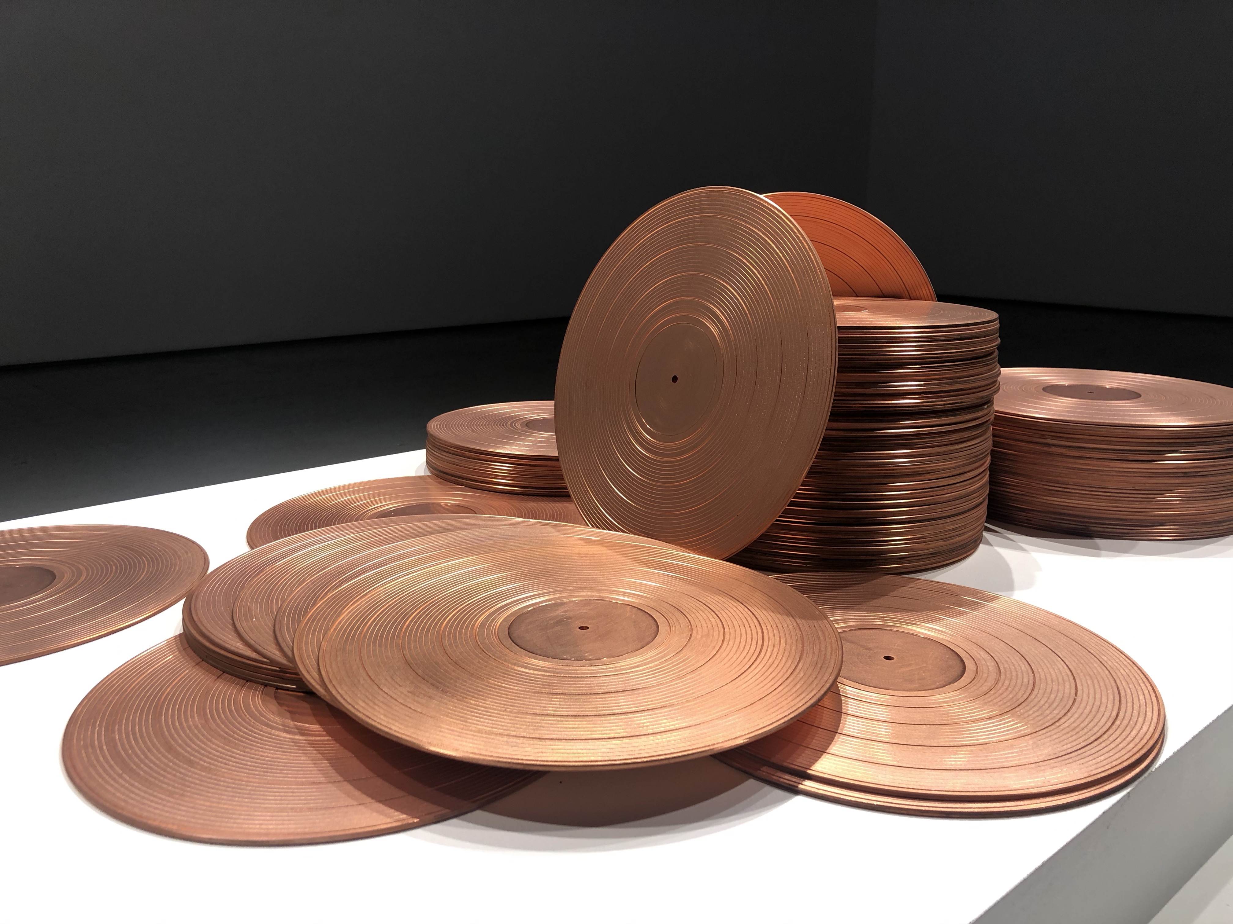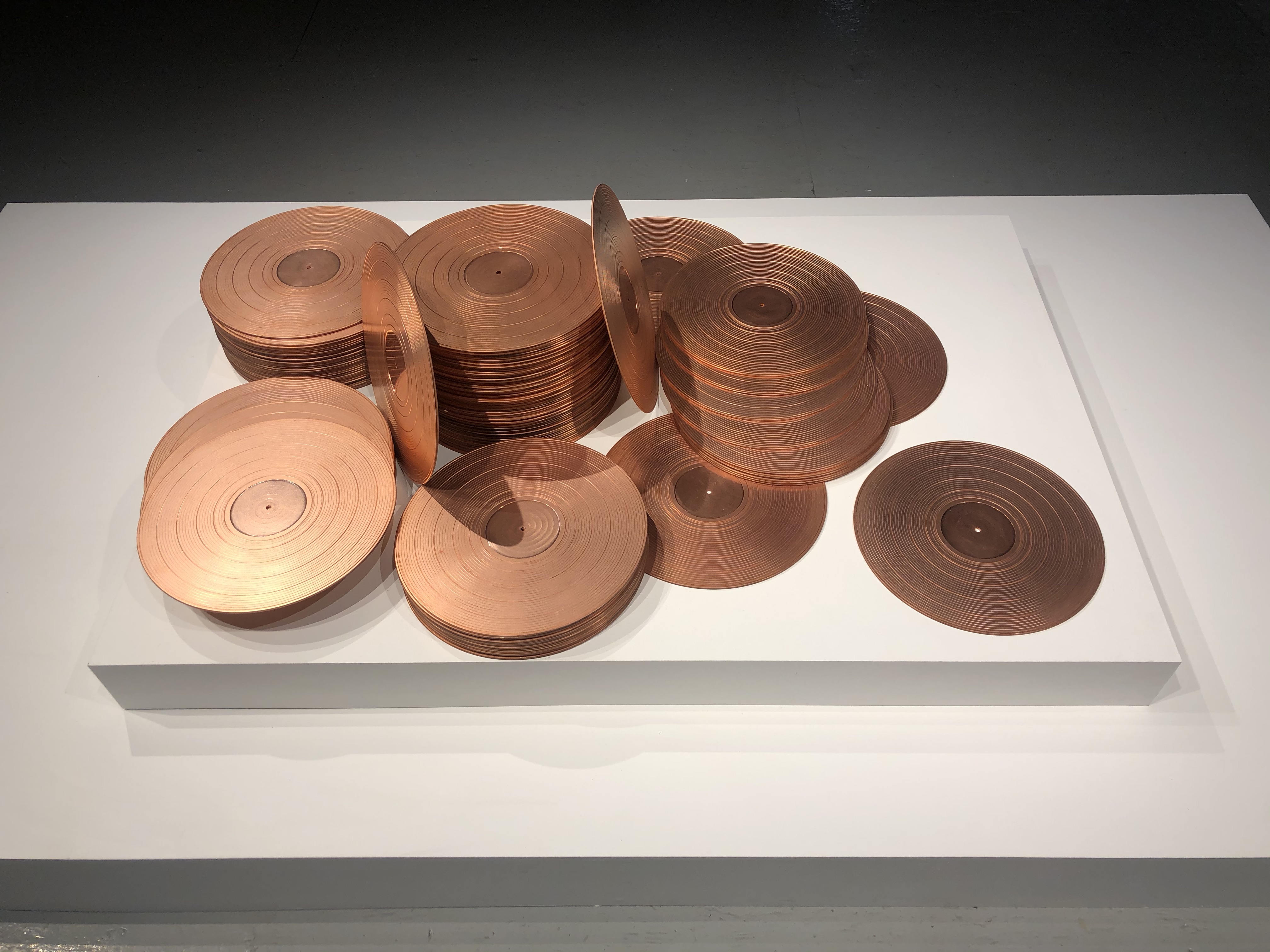 Sonny Assu (Ligwiłda'xw Kwakwaka'wakw from Wei Wai Kum Nation), Ellipsis, 2012. 136 Copper Records, Dimensions variable: (Each: 11 3/4 × 11 3/4 in.). (Overall wall size: 156 × 636 in.). Forge Project Collection, traditional lands of the Moh-He-Con-Nuck.