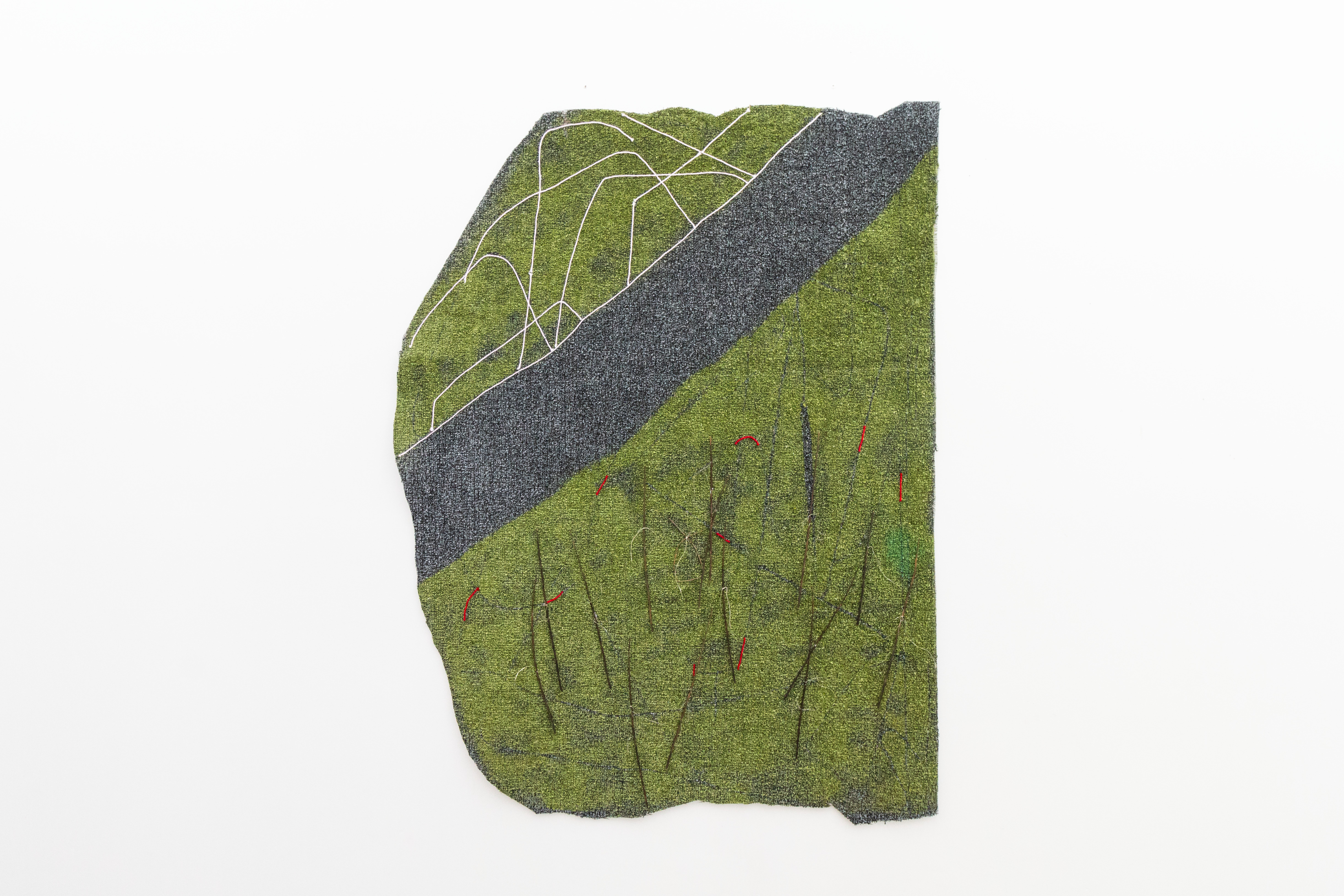 Teresa Baker (Mandan/Hidatsa), Forest, 2019. Willow, yarn, spray paint and buffalo sinew on AstroTurf, 69 × 52 in. Forge Project Collection, traditional lands of the Moh-He-Con-Nuck.