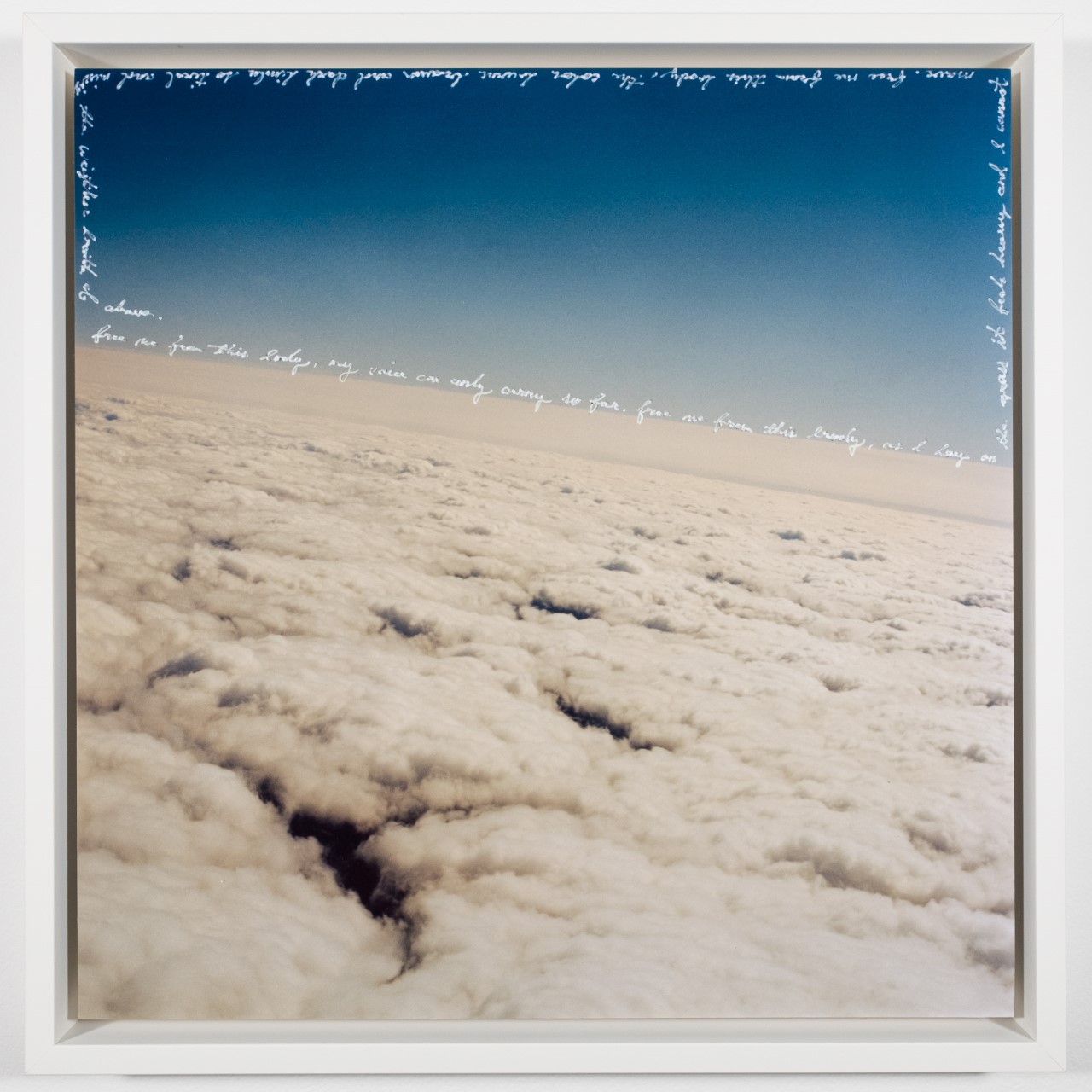 Sky Hopinka (Ho-Chunk Nation/Pechanga Band of Luiseño Indians), Free me from this body, my voice can carry only so far. Free me from this body, as I lay on the grass it feels heavy and I can't move. Free me from this body, the color burns brown with dark limbs so tired and missing the weightless breadth of above., 2020. Inkjet with hand-scratched text, Framed: 181/2 × 19 in. (17 × 17 in.). Forge Project Collection, traditional lands of the Moh-He-Con-Nuck.