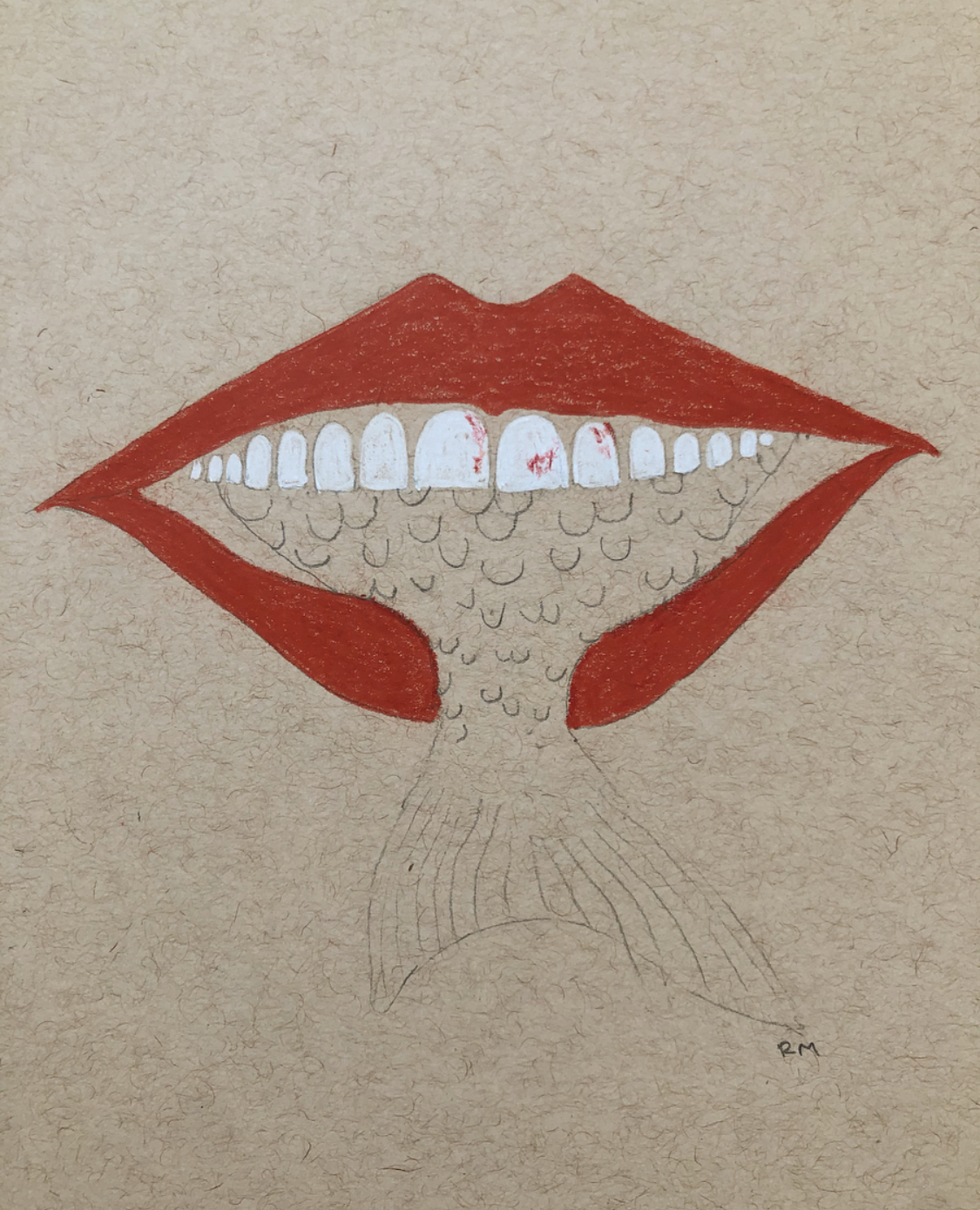 Rachel Martin (Tlingit/Tsaagweidei, Killer Whale Clan, of the Yellow Cedar House (Xaai Hit’) Eagle Moiety), Lipstick Teeth, 2019. Colored pencil and graphite on paper, 9 × 12 in. (Framed: 13 5/16 × 151/2 × 1 5/16 in.). Forge Project Collection, traditional lands of the Moh-He-Con-Nuck.