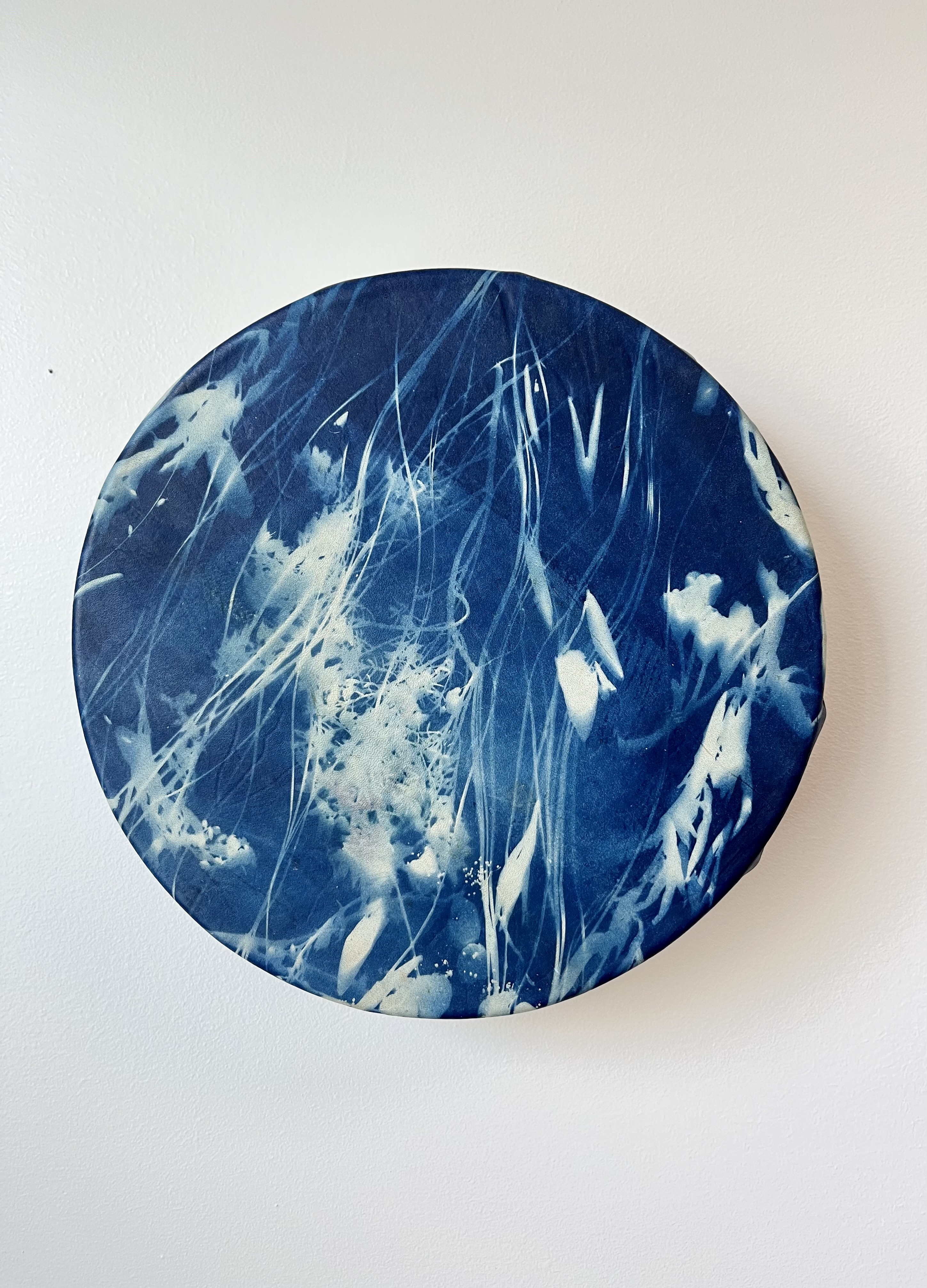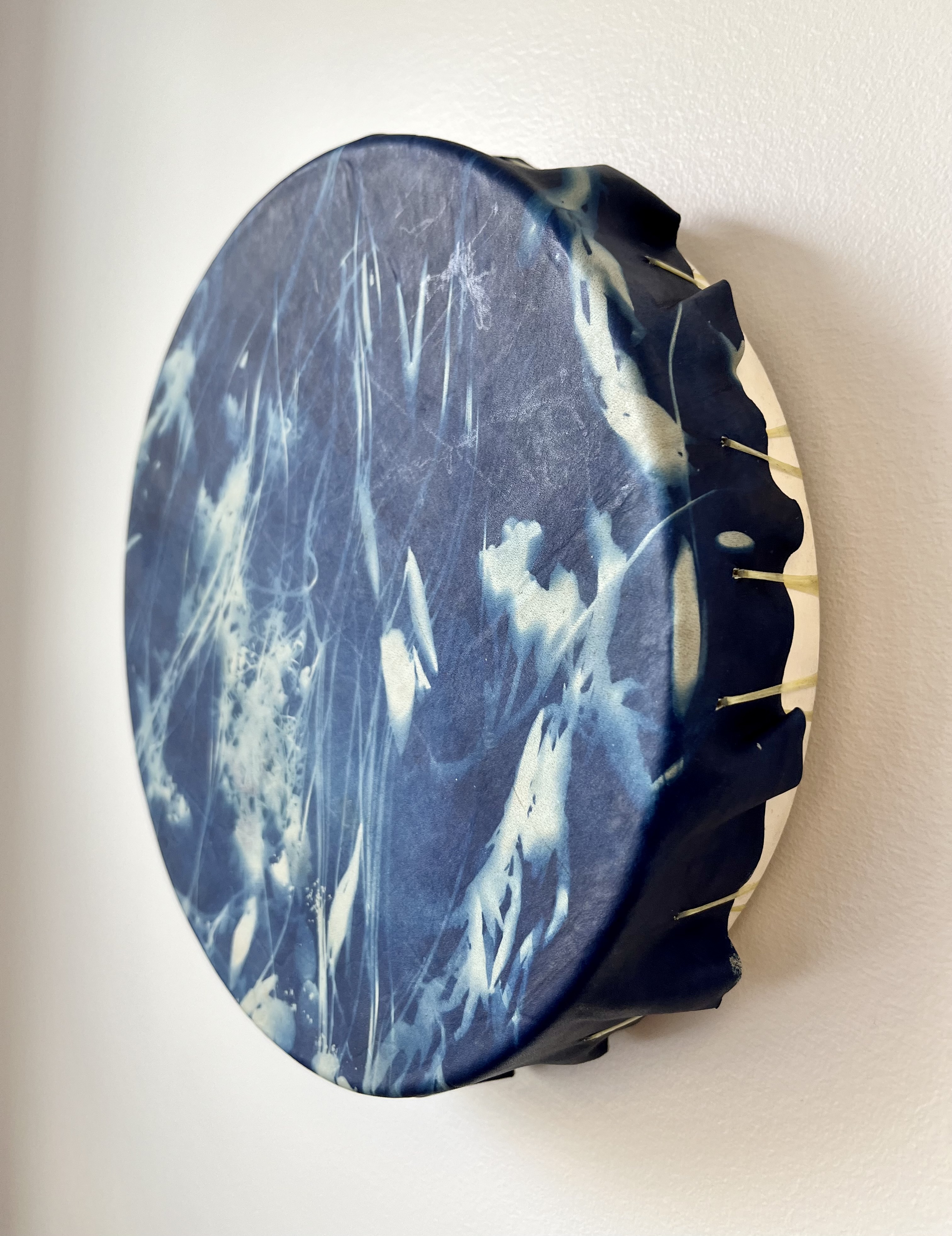Michelle Sound (Cree and Métis, Member of Wapsewsipi Swan River First Nation), Medicine Print Drums, Series 1 [Drum 1], 2023. 10-inch diameter Elkhide Cyanotype drum, wood frame, and sinew, 10 × 10 × 2 in. Forge Project Collection, traditional lands of the Moh-He-Con-Nuck.