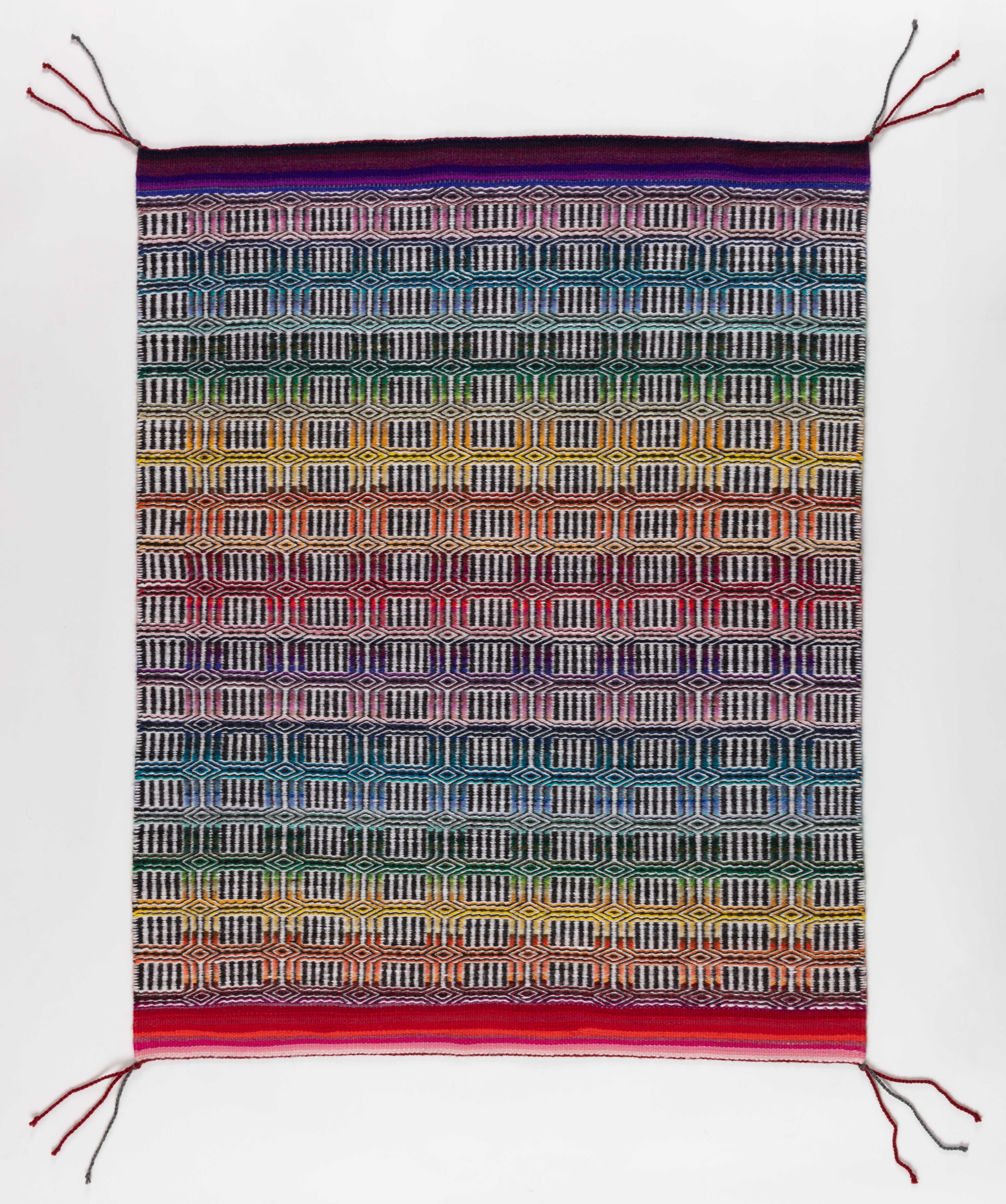 Venancio Aragón (Diné), Rain and Rainbows 2, 2022. Natural dyes (indigo, madder root, turmeric, Navajo tea, dock root, onion skins, cochineal, and rabbit brush), synthetic compounds, commercially-spun Mohair/Merino, 100% wool, 44 × 34 in. Forge Project Collection, traditional lands of the Moh-He-Con-Nuck.