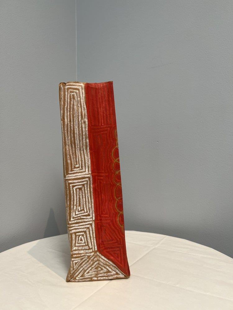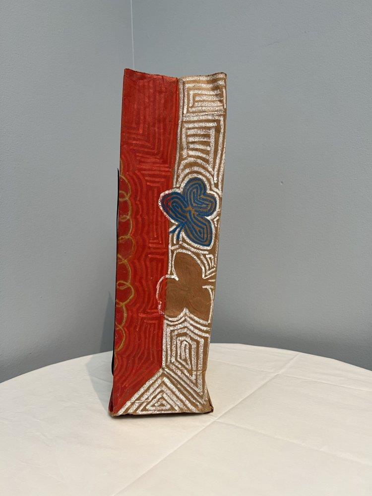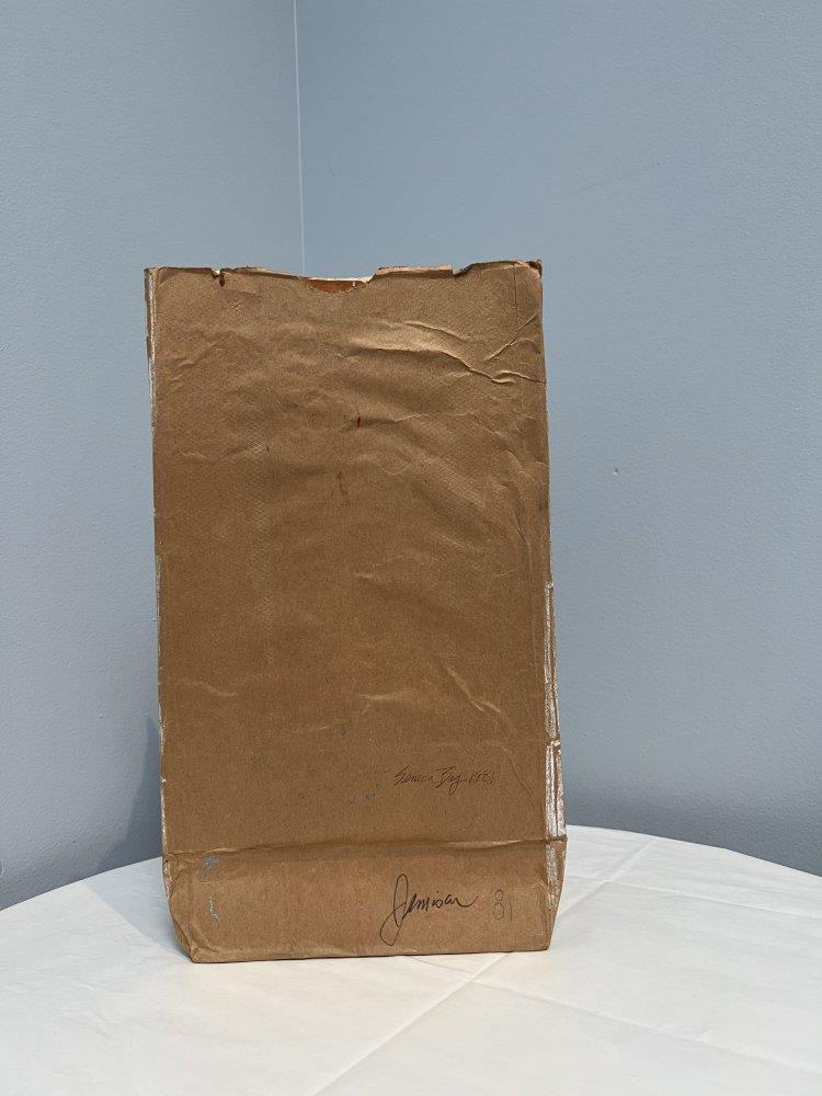 G. Peter Jemison (Enrolled member of the Seneca Nation of Indians, Heron Clan), Seneca Bag, 1981. Cut Paper, China Marker, and Acrylic on Paper Bag, 13 1/2 × 7 1/16 × 3 1/2 in. Forge Project Collection, traditional lands of the Moh-He-Con-Nuck.