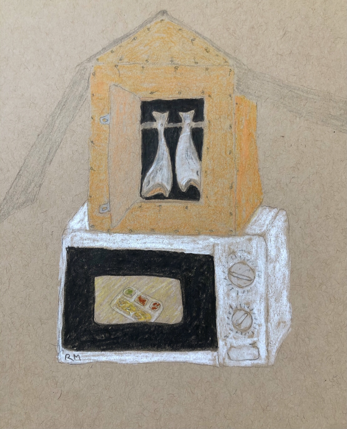 Rachel Martin (Tlingit/Tsaagweidei, Killer Whale Clan, of the Yellow Cedar House (Xaai Hit’) Eagle Moiety), Houseboat Kitchen, 2020. Colored pencil and graphite on paper, 12 × 9 in. (Framed: 151/2 × 13 5/16 × 1 5/16 in.). Forge Project Collection, traditional lands of the Moh-He-Con-Nuck.