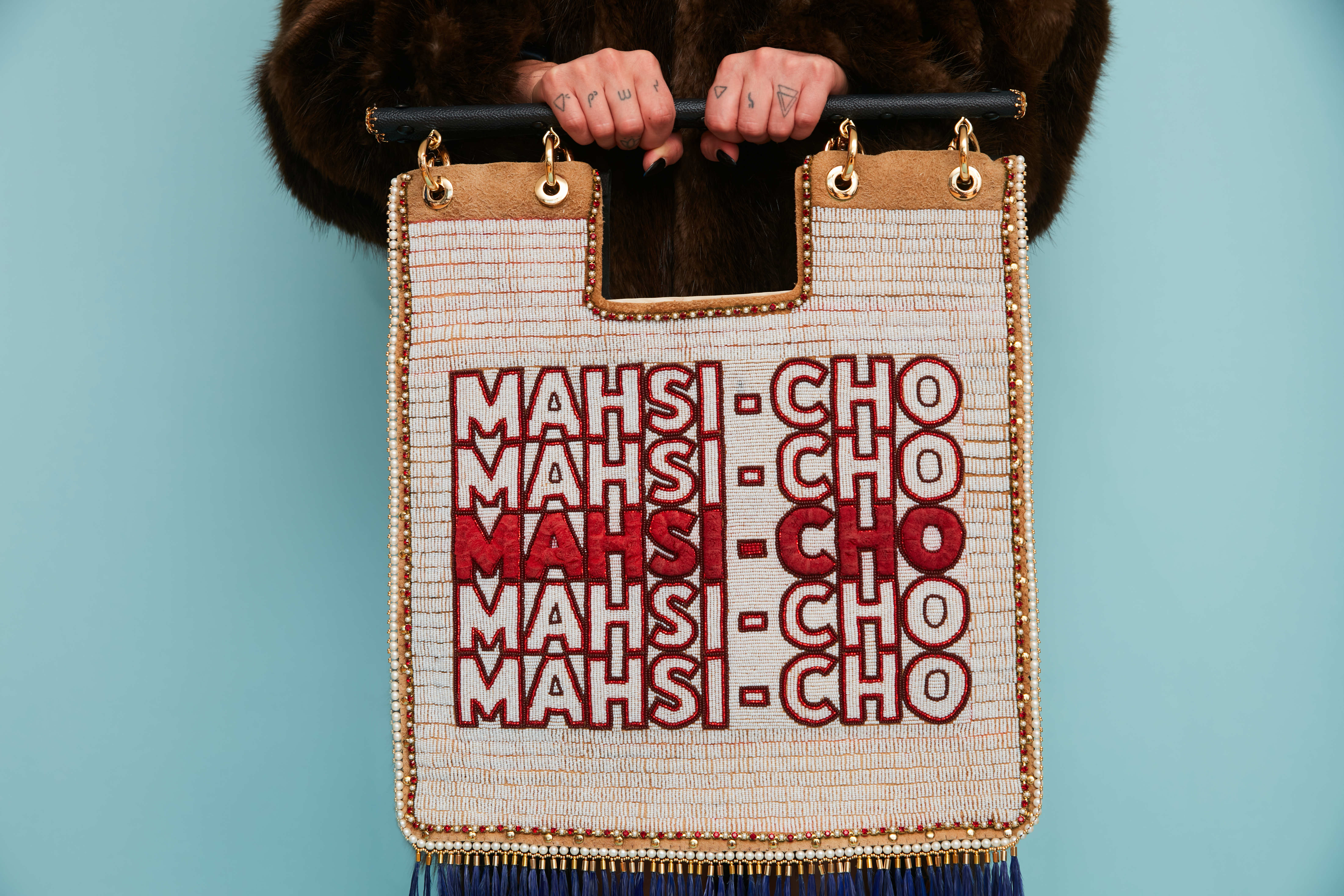 Catherine Blackburn (Dënesųłinë́ and European, English River First Nation), Mahsi Cho Hunting Bag, 2022. Vintage pearl white beads, genuine pearls, home-tanned moosehide, vintage Swarovski bead chain, hand-dyed rooster feathers, lambskin leather, caribou hair tufting, handmade fox fur poms, hand-constructed embossed leather tags, 34 × 18 × 5 in. (Mounted: 34 × 18 × 7 in.). Forge Project Collection, traditional lands of the Moh-He-Con-Nuck.